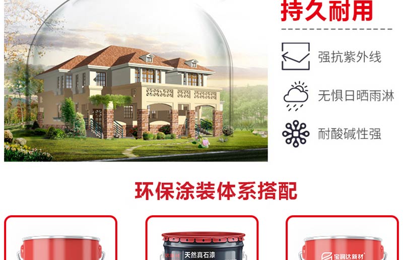 采用优质纯丙烯酸、天然优质矿石和助剂精制而成,具有良好的耐候性、耐污性,对中涂起到很好的保护作用,使其涂料外观色泽更持久、亮丽。其天然的色彩,庄重朴实的效果,特别适合时尚经典豪华建筑物外墙装饰。